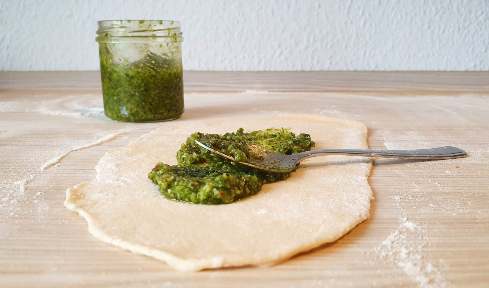 Wenn der Teig so weit ist, teilst du dir die gewünschte Brötchengröße ab, drückst sie ein wenig platt bestreichst sie mit Pesto und formst sie wieder zu einem Brötchen. Wenn etwas Pesto herausschaut, ist das nicht schlimm. Alternativ kannst du die einzelnen Hefestücke auch zu kleinen Kugeln formen, mit dem Kochlöffelgriff ein Loch reindrücken, Pesto einfüllen und das Loch wieder verschließen.